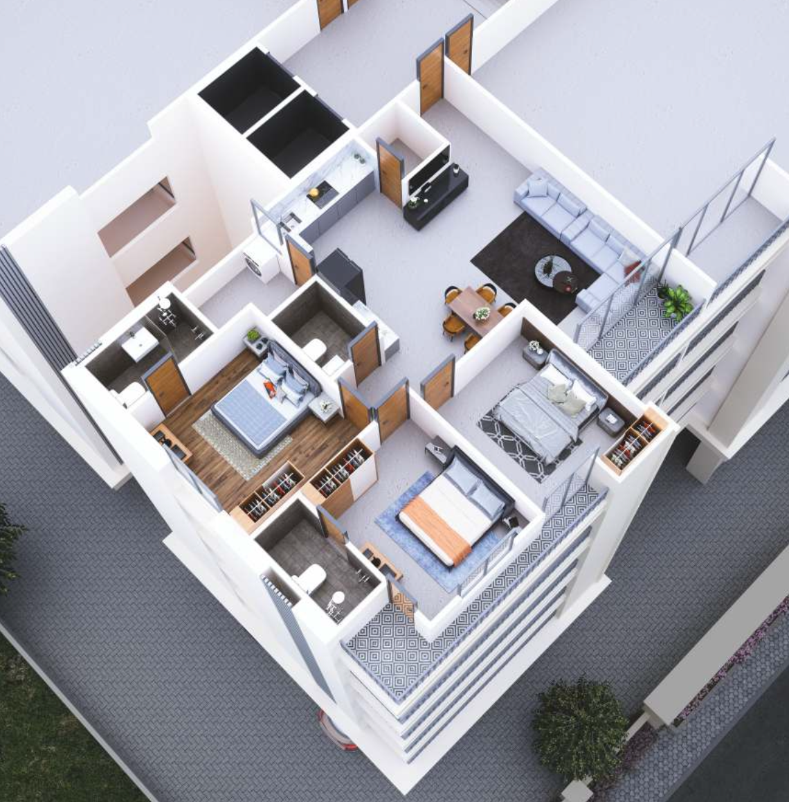 - Internal doors: Flush doors with laminates and stone frames.
